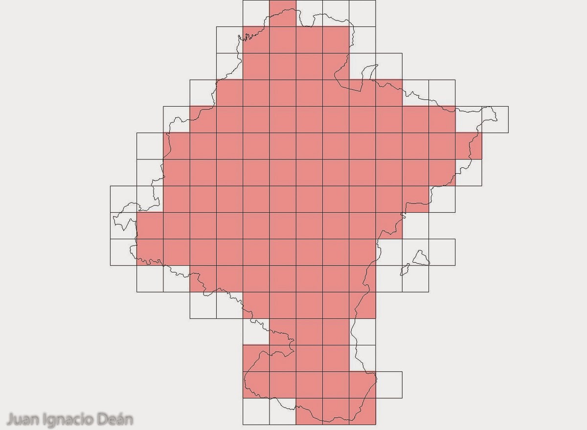 Ciertamente no es apropiado el comparar coberturas diferentes y en consecuencia en una segunda aproximación se han seleccionado únicamente las cuadrículas que se han cubierto todos los años del censo. Resultan 55 cuadrículas con la distribución que se muestra encima, y que resulta bastante uniforme en el conjunto de la provincia.